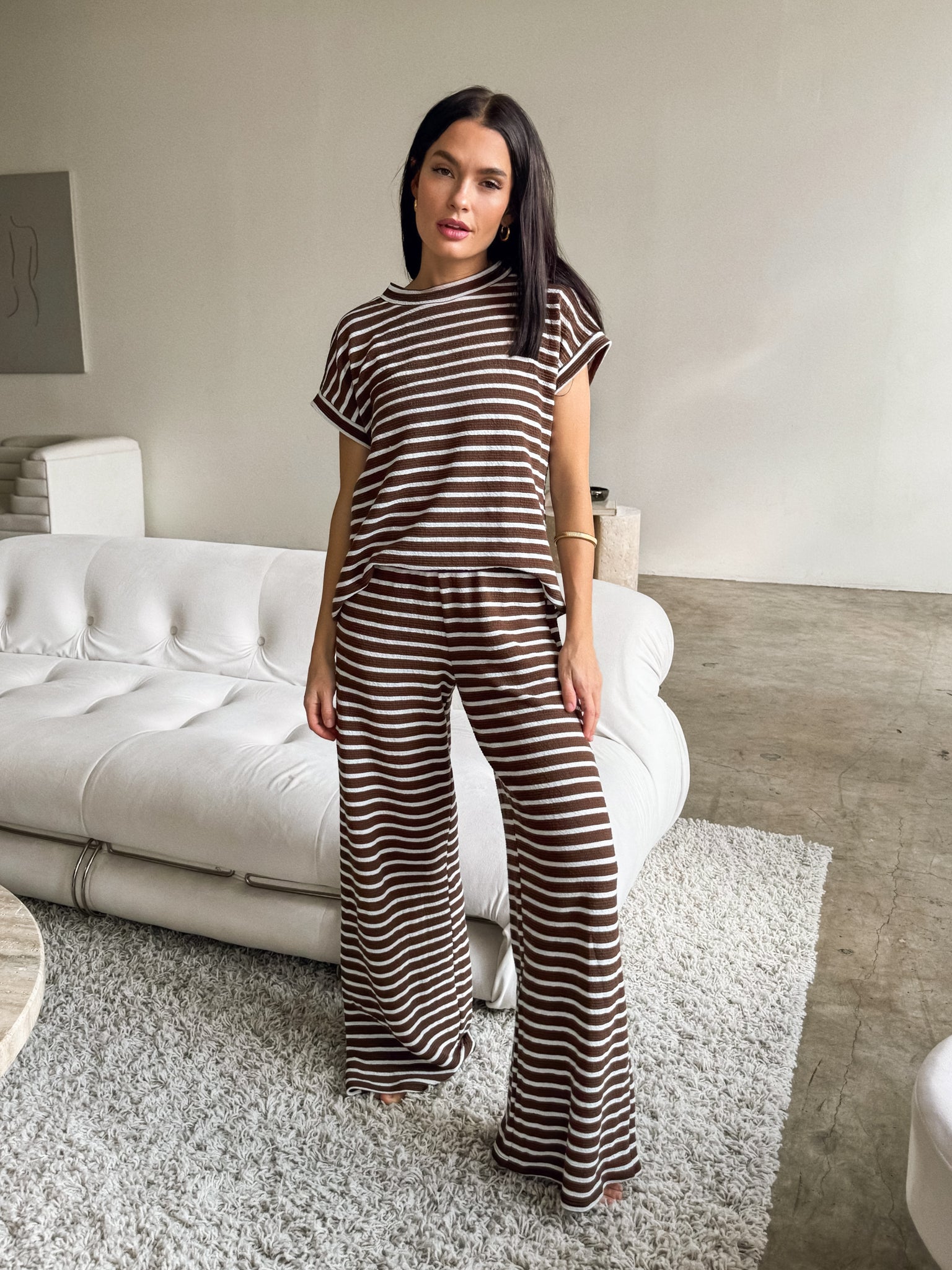 Our New Year’s resolution: wear more stripes. Style our NEW Mocha Stripe Knit Top with our matching pants and uggs for an effortlessly chic look. Pair with a blazer and kitten heel for a more elevated nighttime look!
